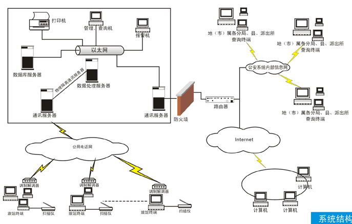 本系统由旅馆前台登记系统、市局治安处后台中心系统、市局综合信息中心系统 、各业务部门使用终端四部分组成,旅馆通过DDN专线或拨号方式与治安处中心数据库联接,治安处中心系统使用数据转换通过公安光纤与市局综合信息中心系统定时联接。旅馆前台登记系统负责录入各项旅客信息,并将信息实时传输到公安后台,公安后台中心系统自动比对所有旅客信息,对符合布控、通缉条件的对象,立即自动报警,各业务相关部门通过WEB浏览器访问中心系统旅业数据,方便、快捷的完成各项查询、统计、监控、报表处理、分析对比等工作。